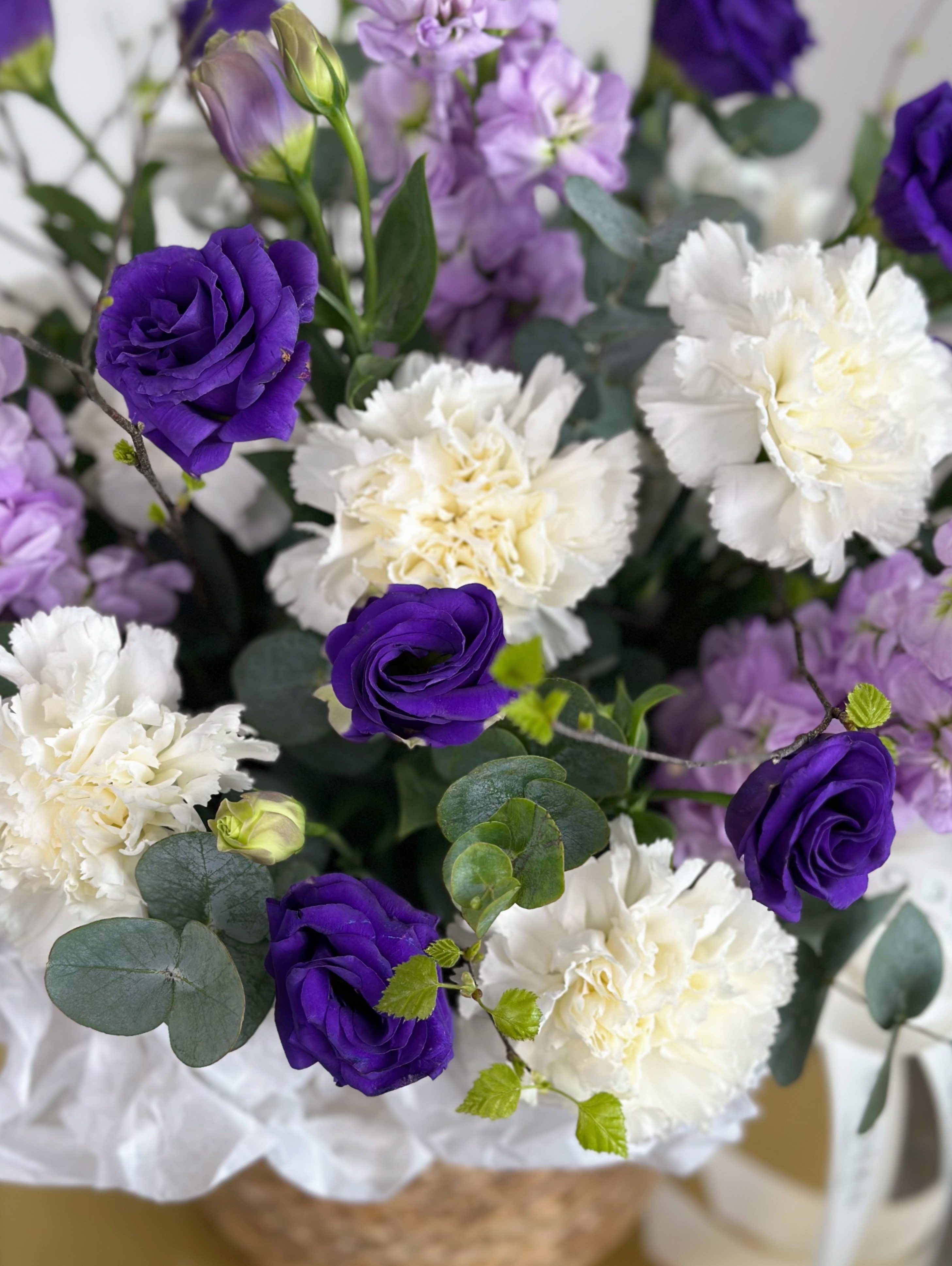 АРОМАТНАЯ МАТТИОЛА, ЭУСТОМА, ВЕСЕННИЕ ВЕТОЧКИ В ПЛЕТЕНОЙ КОРЗИНЕ