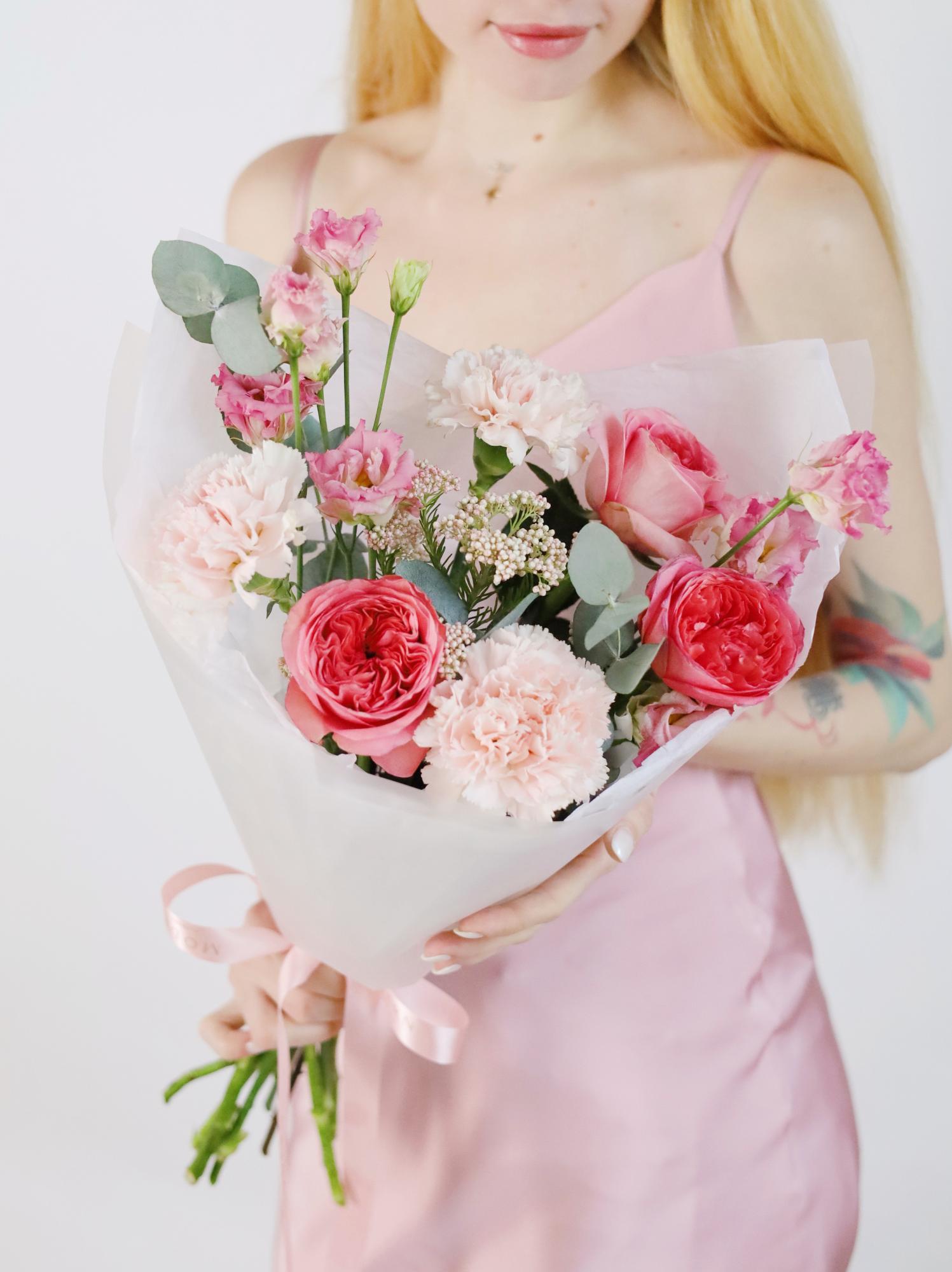 БУКЕТ С ПИОНОВИДНОЙ РОЗОЙ, ЭУСТОМОЙ И ОЗОТАМНУСОМ