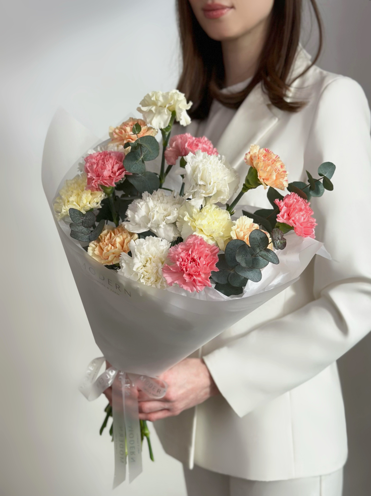 БУКЕТ В ПАСТЕЛЬНЫХ ОТТЕНКАХ ИЗ ГВОЗДИКИ И ЭВКАЛИПТА