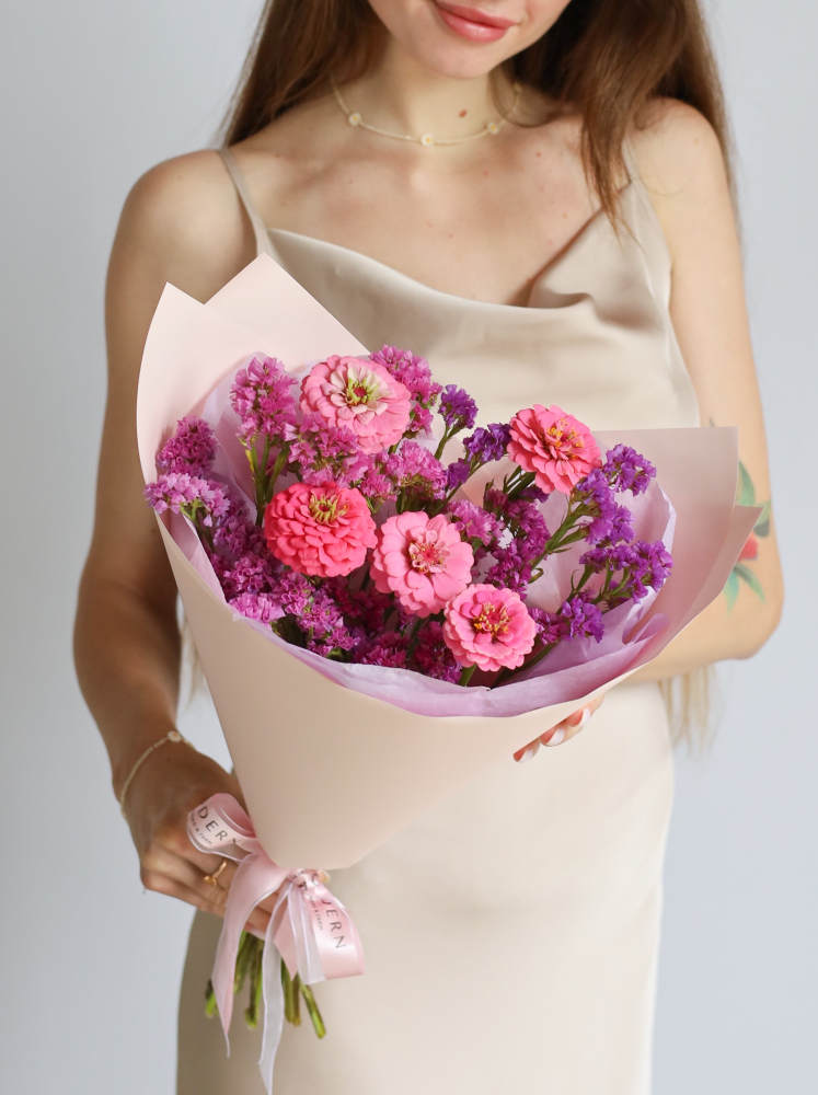 БУКЕТ С ЦИННИЕЙ И СТАТИЦЕЙ