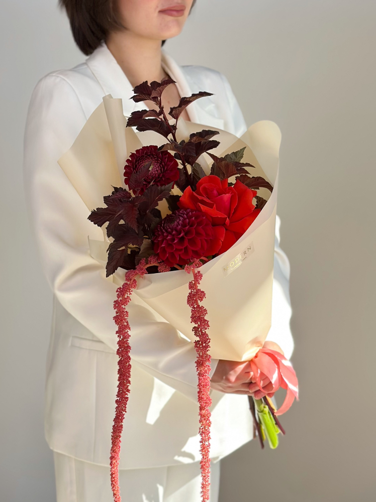 БУКЕТ С ГЕОРГИНАМИ, РОЗОЙ И АМАРАНТОМ
