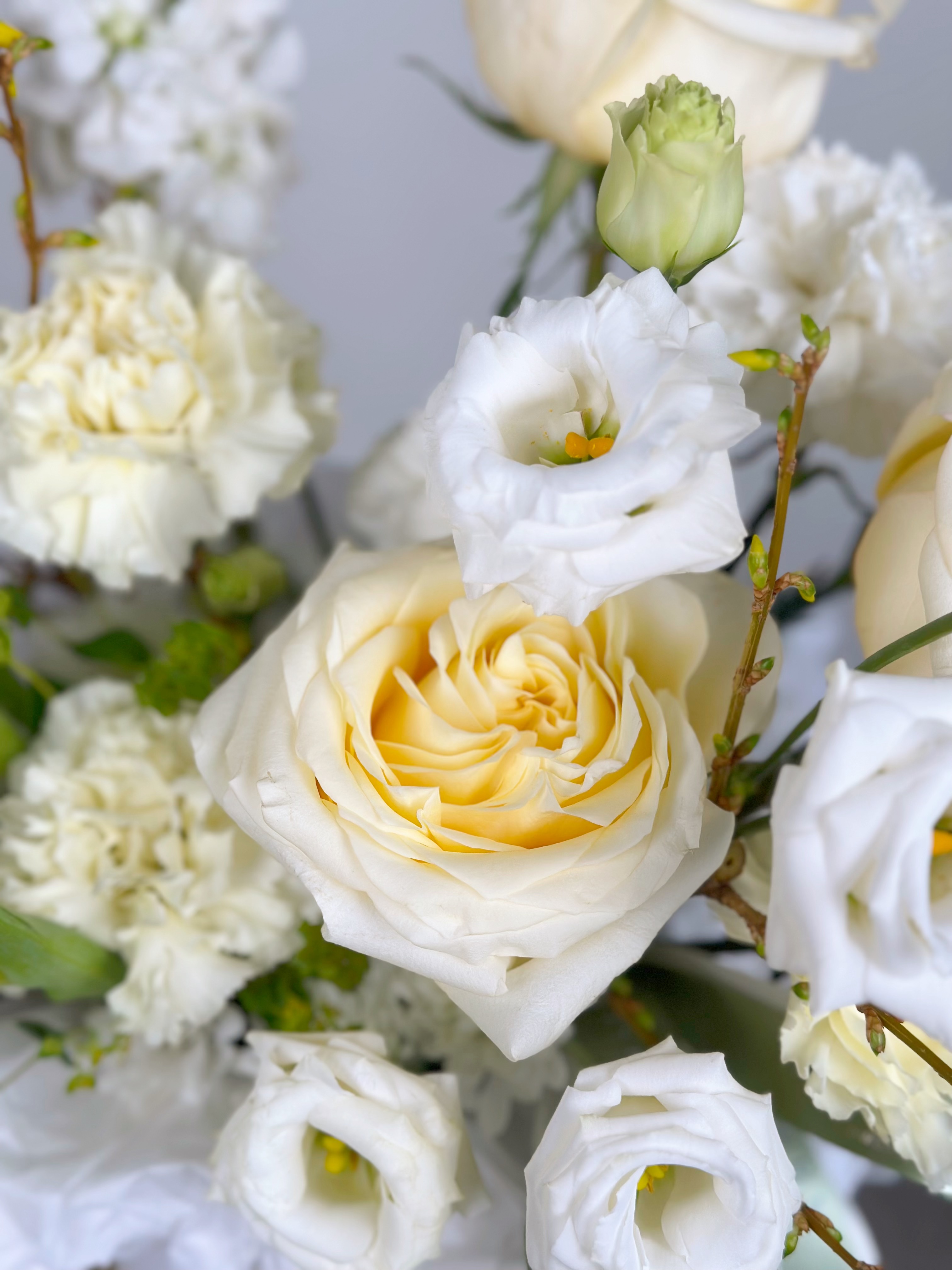 —КОМПОЗИЦИЯ С ПИОНОВИДНОЙ РОЗОЙ, МАТТИОЛОЙ И ВЕТОЧКОЙ ФОРЗИЦИИ
