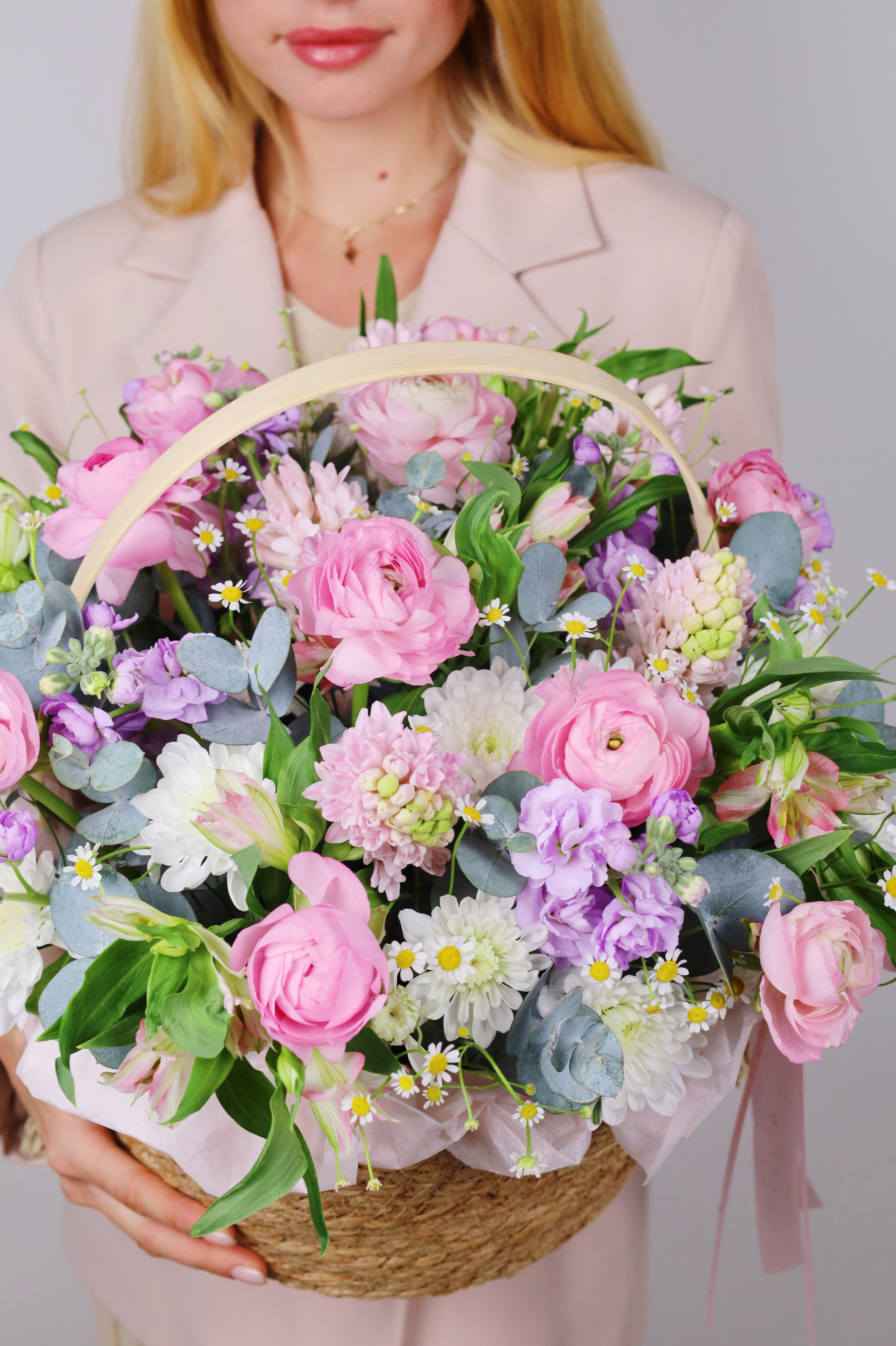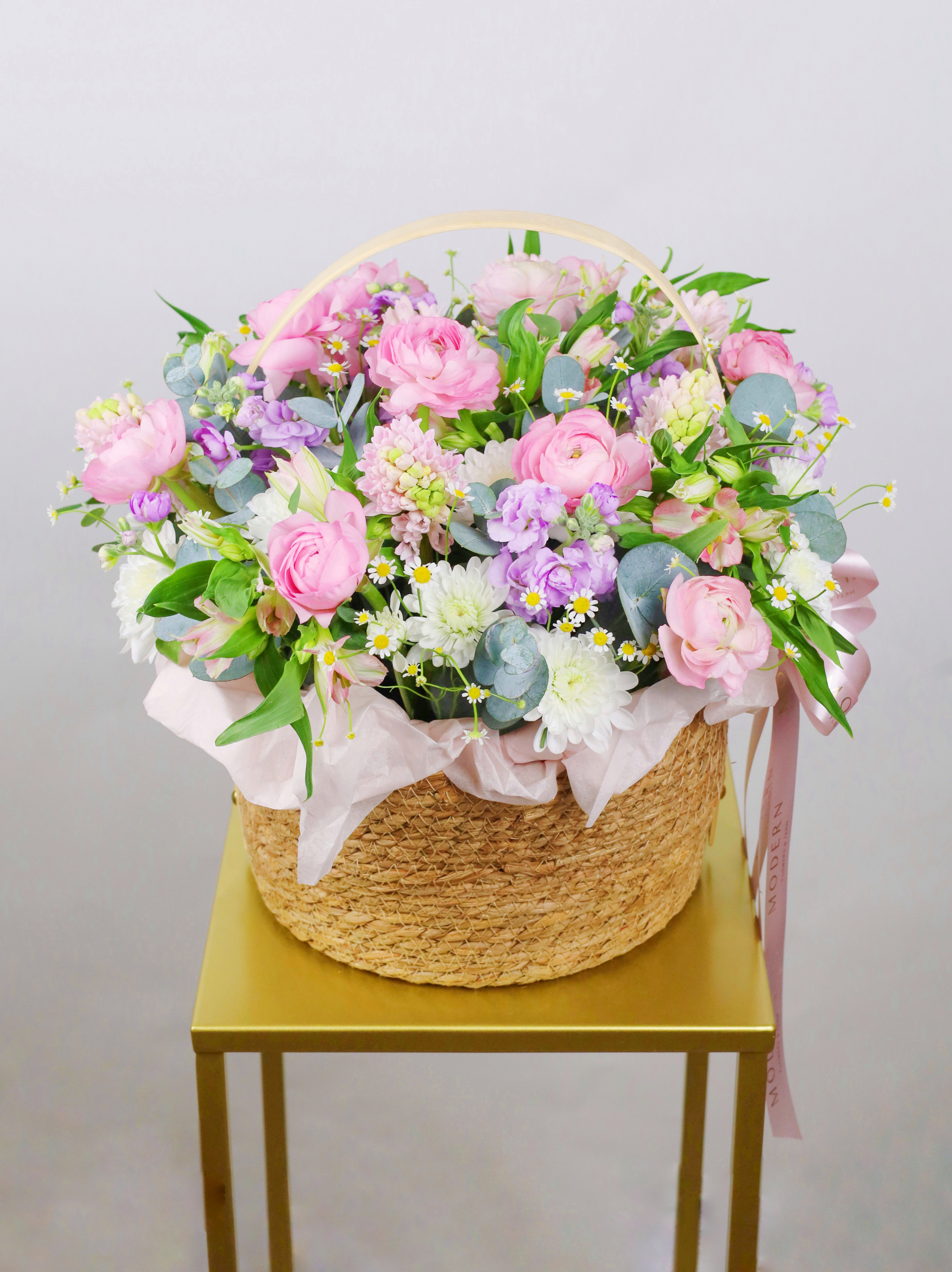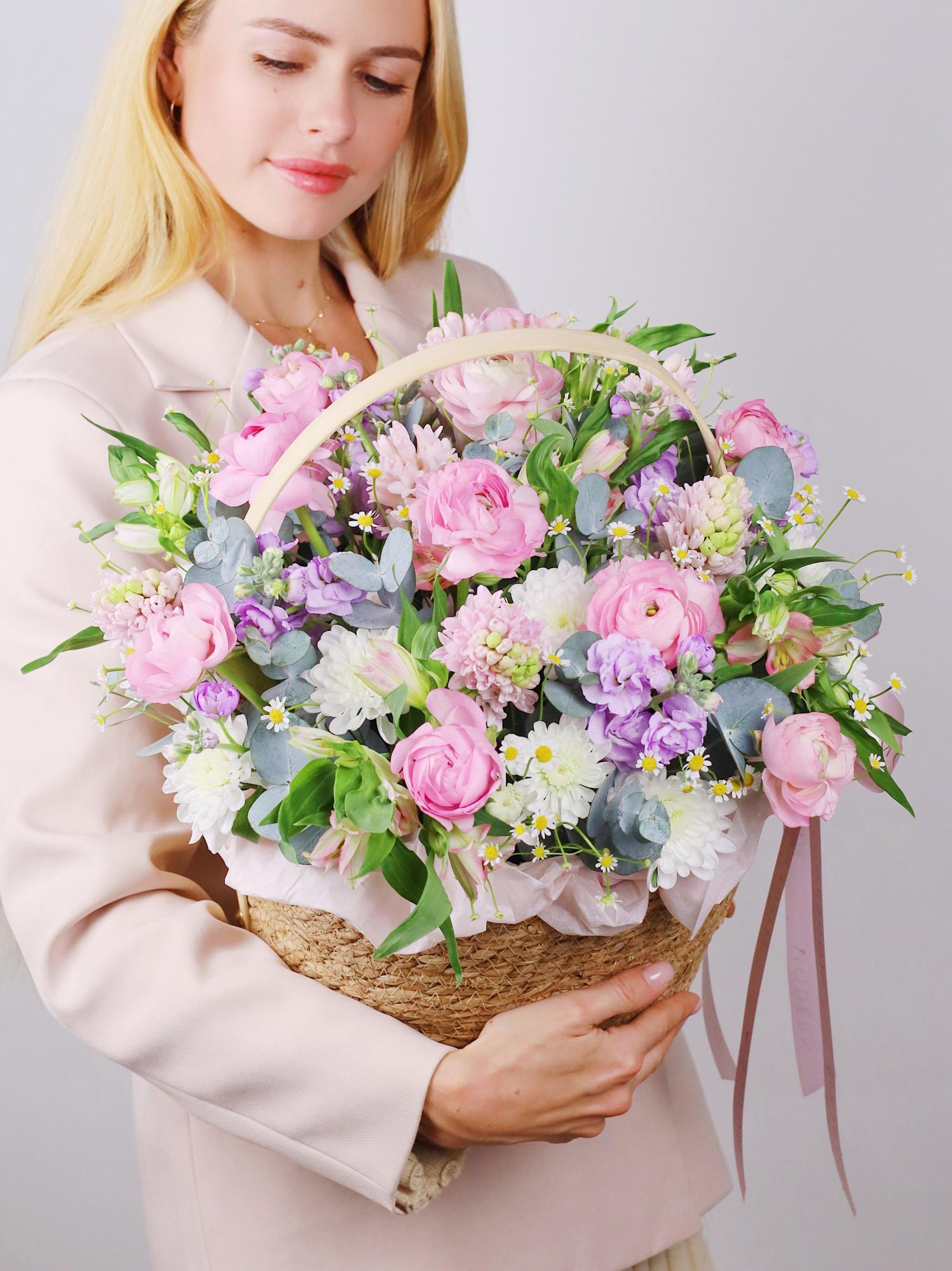 КОРЗИНА С РАНУНКУЛЮСАМИ, МАТТИОЛОЙ И ЭВКАЛИПТОМ