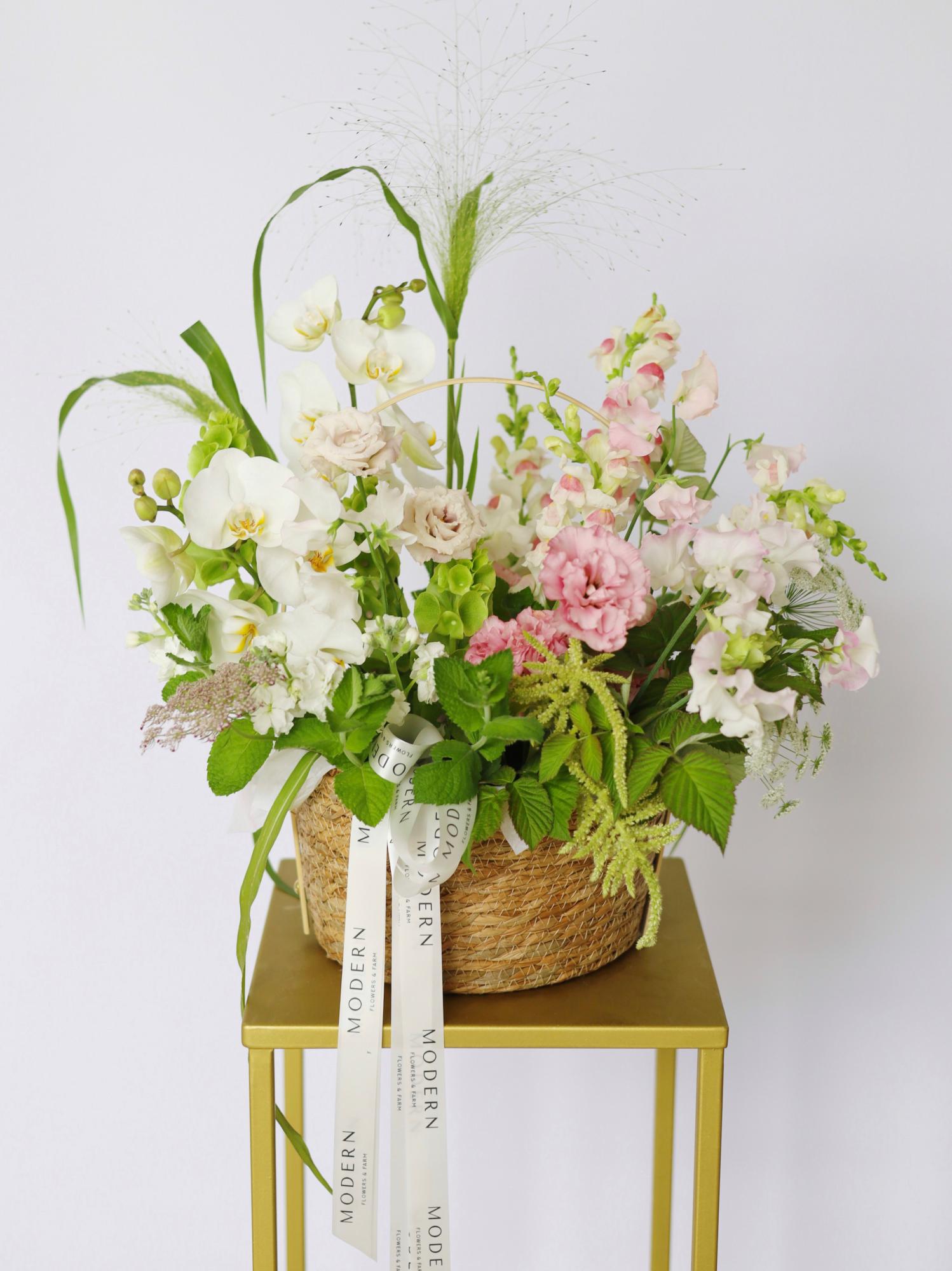 Представляем вашему вниманию утонченную цветочную композицию, где элегантность орхидей гармонично сочетается с очарованием сезонных летних цветов.