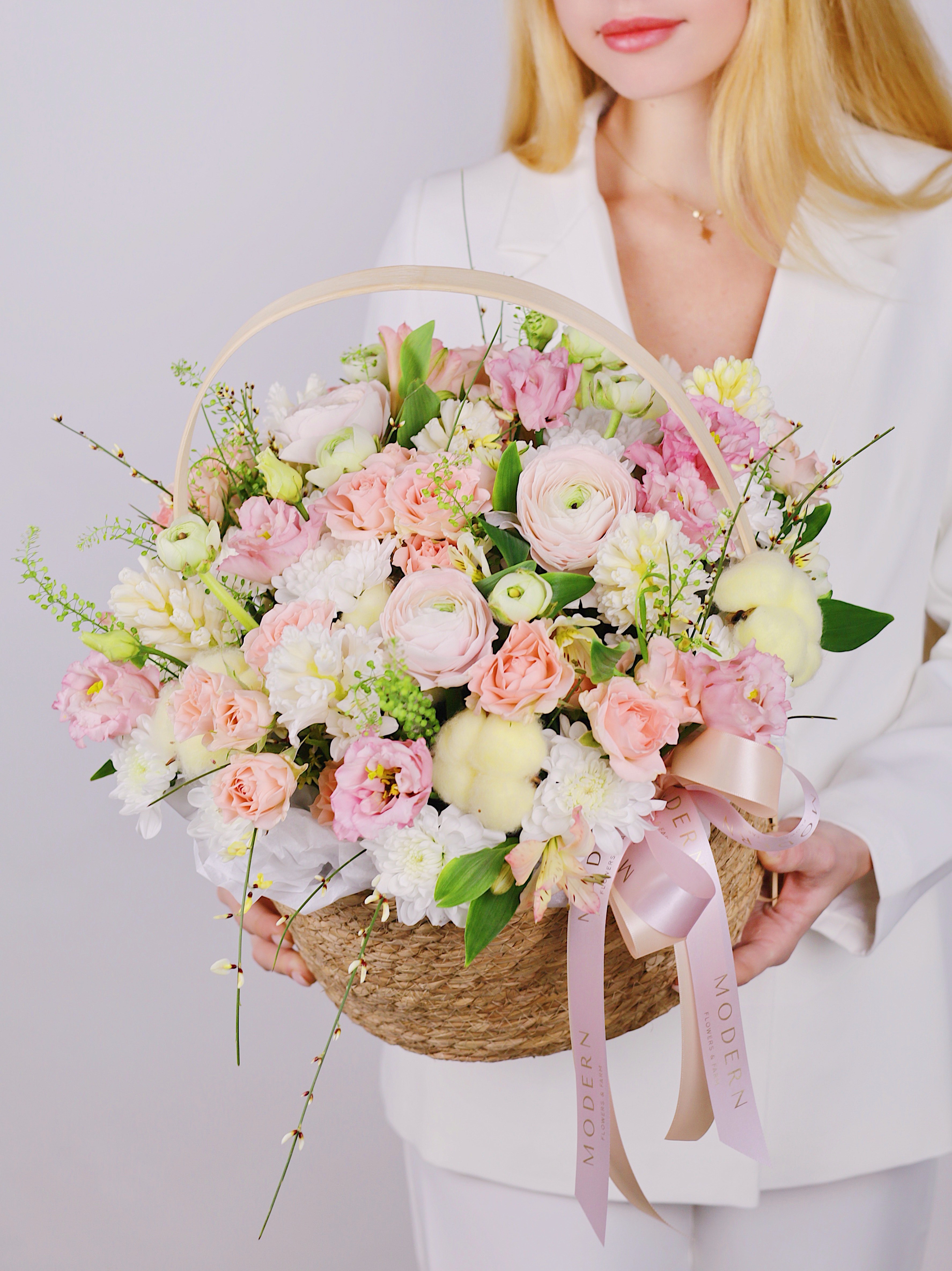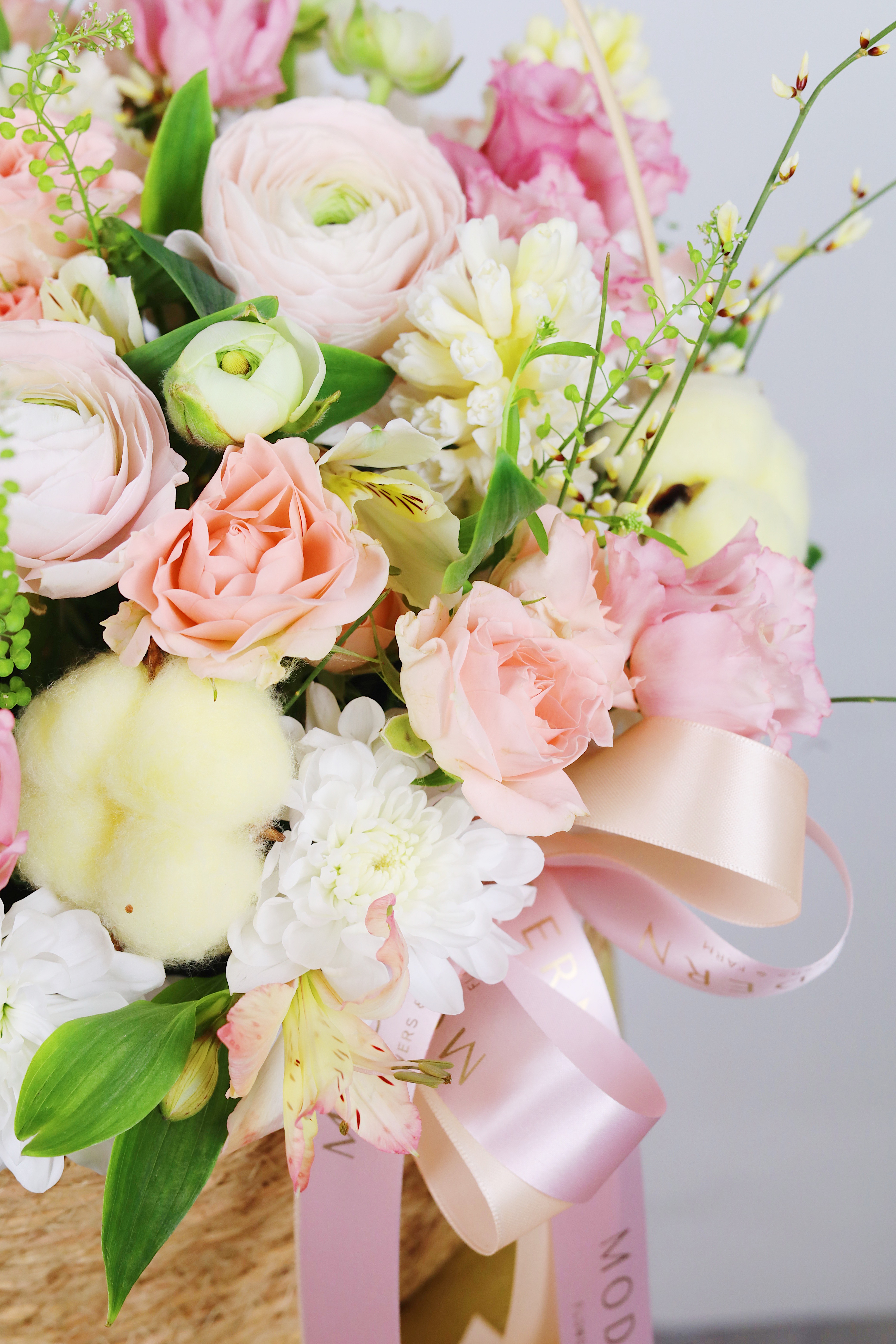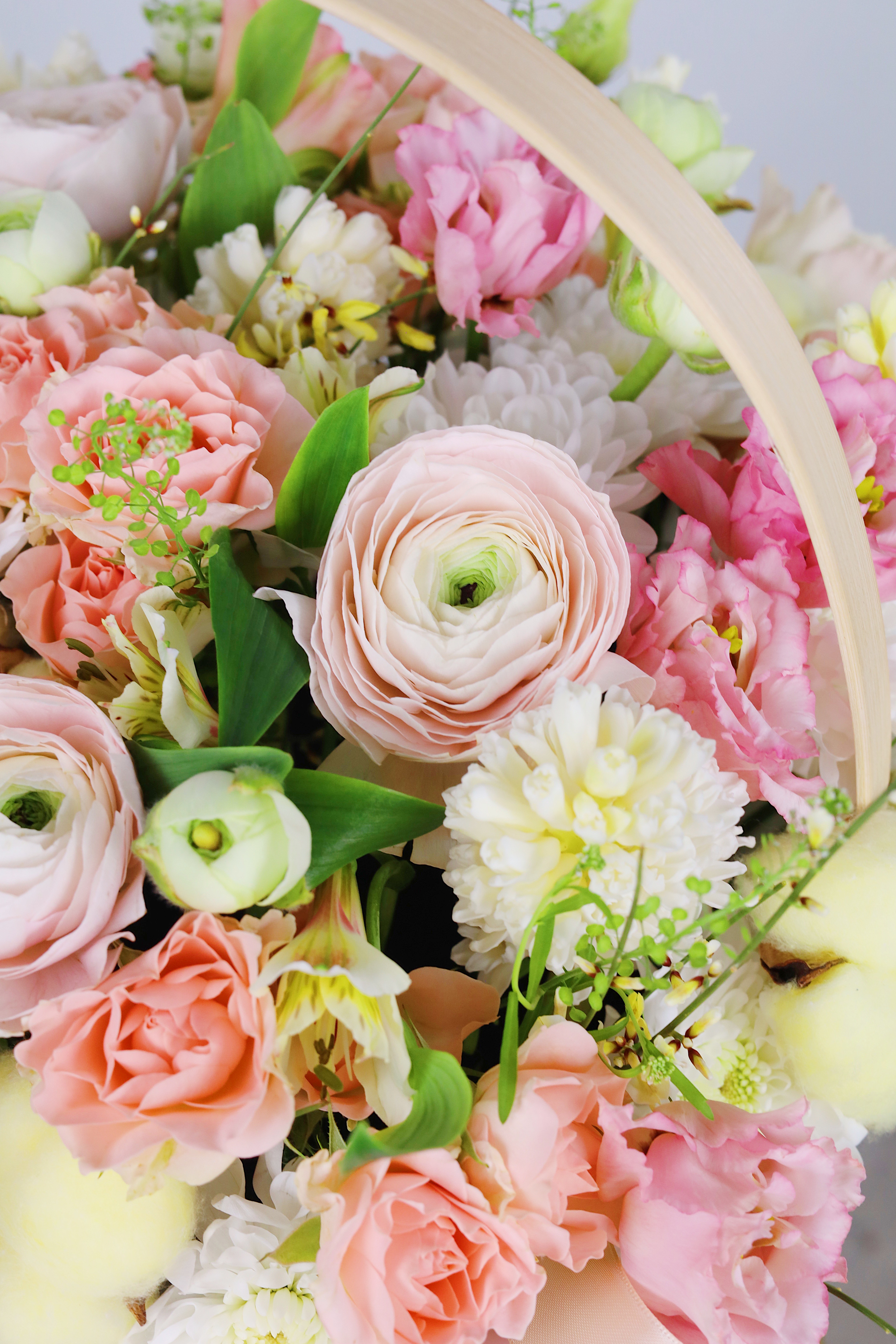 —НЕЖНАЯ КОРЗИНА С РАНУНКУЛЮСАМИ, РОЗОЙ И ХЛОПКОМ