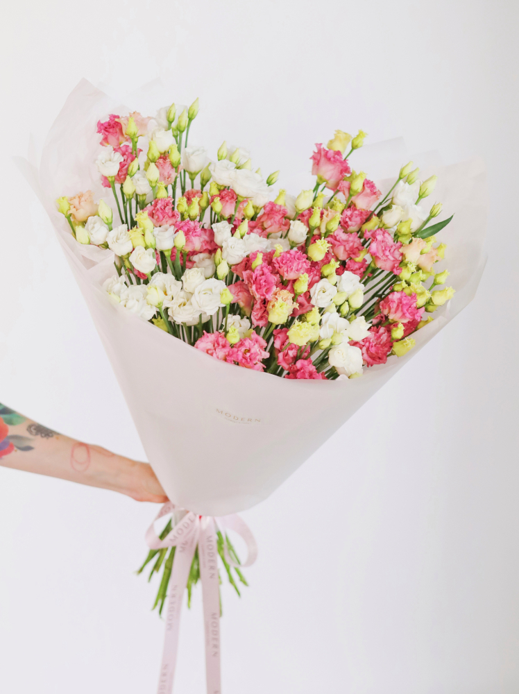 Лизиантус стильно смотрится и в моноохапке с добавлением зелени (эвкалипта), и в сборной композиции в сочетании с: